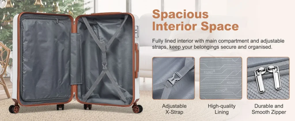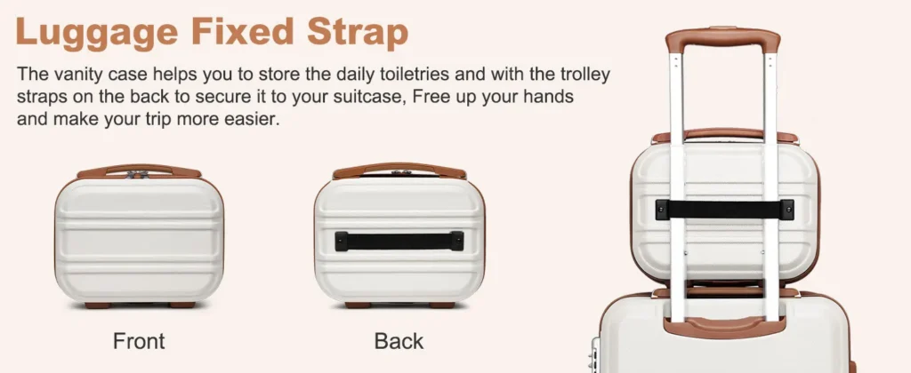 Interior Organization: The suitcases have two spacious, fully lined compartments for efficient double-sided packing. The toilet bag has a mesh zipper bag ideal for cosmetics, toiletries, and smaller items.