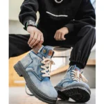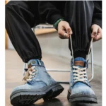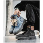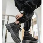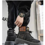 Channel a rugged, frontier-inspired look with these modern retro ankle boots, built for durable, everyday wear. They feature a distressed black suede-look upper with contrast stitching and a decorative brown leather patch near the collar, giving them an authentic, vintage appeal. The boot is grounded by a thick, heavy-duty lug sole that provides exceptional stability and a masculine silhouette. The lace-up design ensures a snug, secure fit, making these the perfect versatile choice for pairing with jeans or tactical trousers.