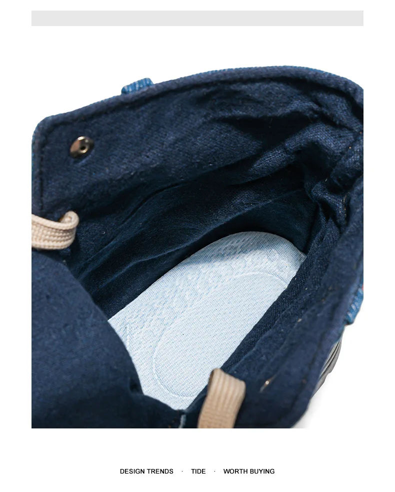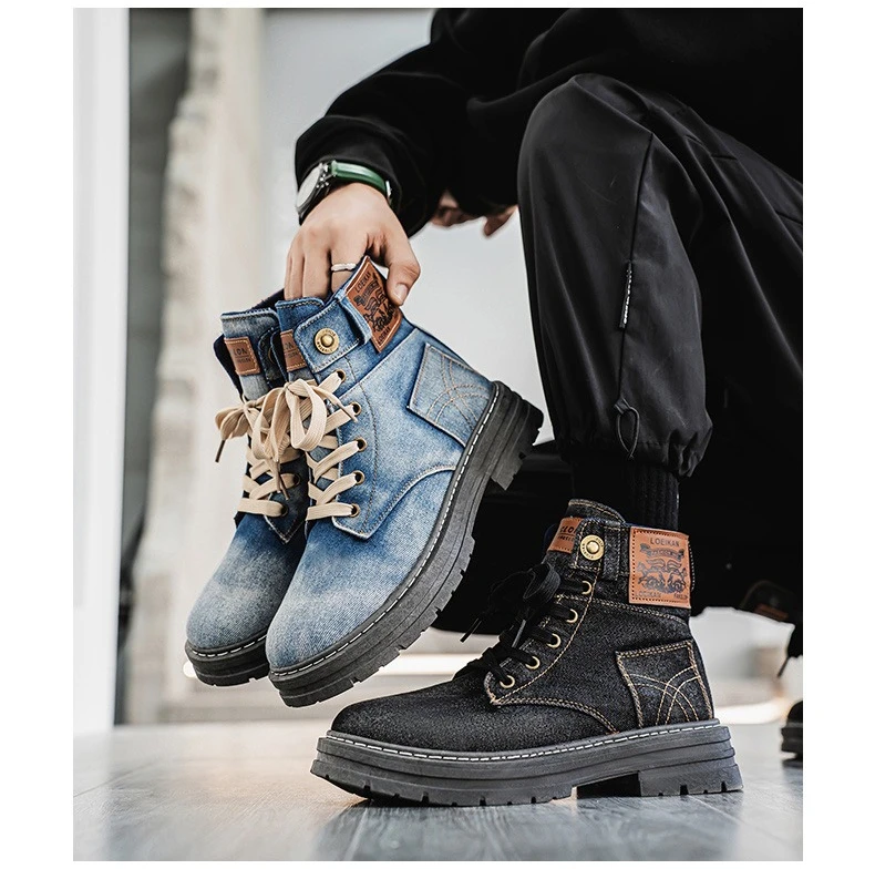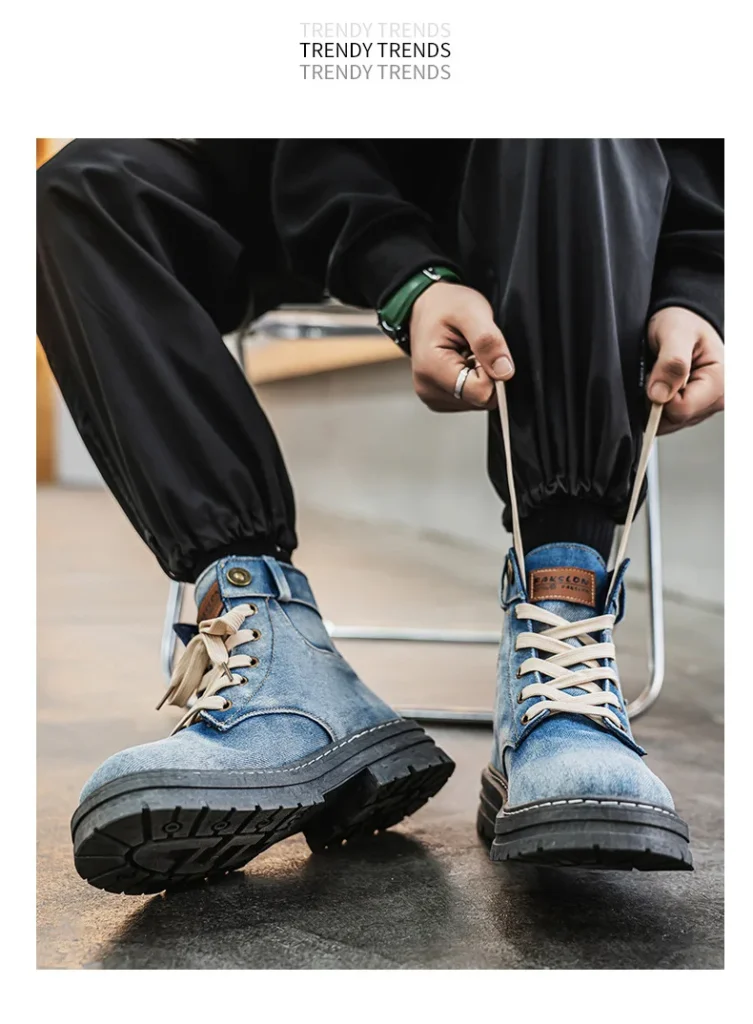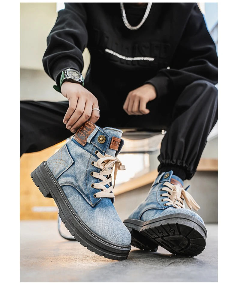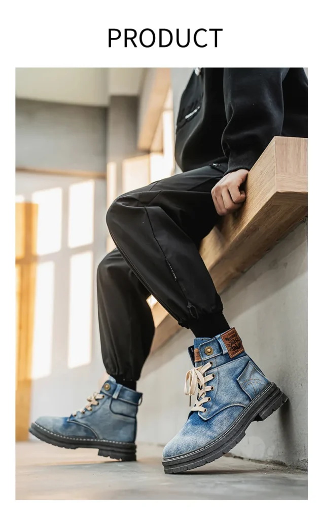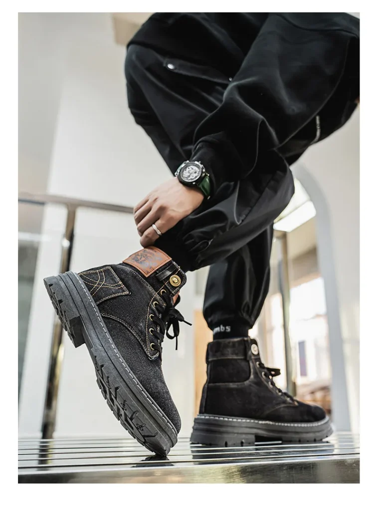 Channel a rugged, frontier-inspired look with these modern retro ankle boots, built for durable, everyday wear. They feature a distressed black suede-look upper with contrast stitching and a decorative brown leather patch near the collar, giving them an authentic, vintage appeal. The boot is grounded by a thick, heavy-duty lug sole that provides exceptional stability and a masculine silhouette. The lace-up design ensures a snug, secure fit, making these the perfect versatile choice for pairing with jeans or tactical trousers.